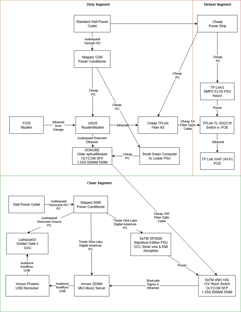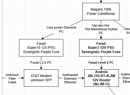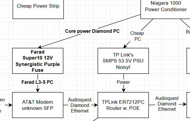 - Use a true power conditioner on your dirty side network gear (modem, router) . i.e. Shunyata Gemeni, Audioquest Niagara 1000, Audioquest Niagra 1200, etc