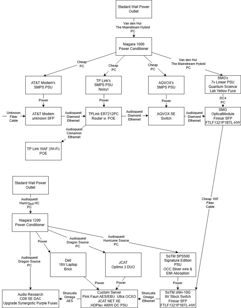 Even with fiber isolation in place, I’m still hearing distinct changes when I modify components on the dirty side of the chain. Whether it’s a power supply, a switch, or a cable, the changes are real, recordable, and repeatable. So I set out to document them—using dual-DSD recordings and a carefully controlled headphone rig to critically evaluate each tweak.